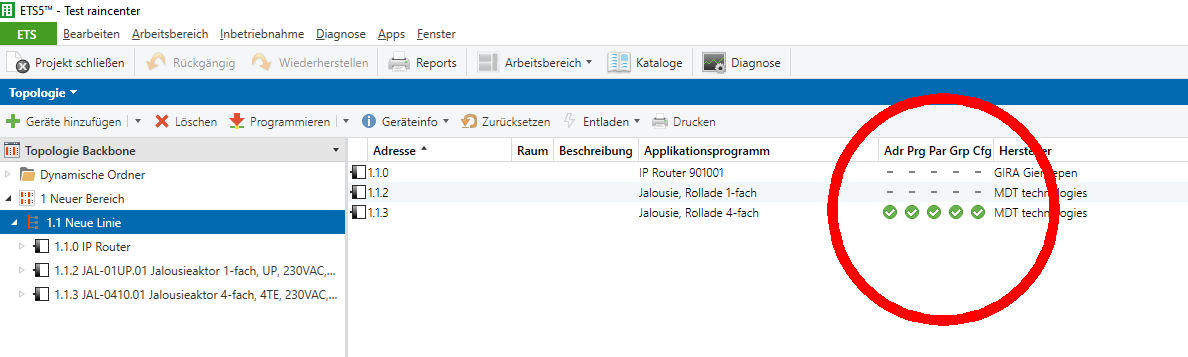 Ja genau, die 5 grünen Haken in der ETS sind dann bei den anderen Geräten weg.